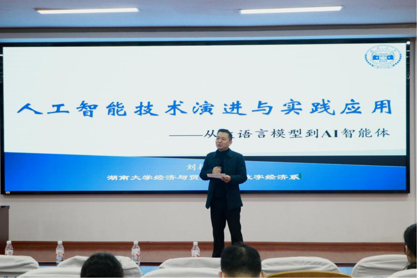 4月21日下午,湖南科技大学商学院立言讲坛第213讲在第三教学楼101学术报告厅举行,此次讲座由校人事处与商学院联合主办。湖南大学经济与贸易学院数字经济系教授刘征驰应邀作题为“人工智能技术演进与实践应用:从大语言模型到AI智能体”的学术报告,商学院院长戴魁早主持会议,学院部分教师及硕博研究生参会聆听。