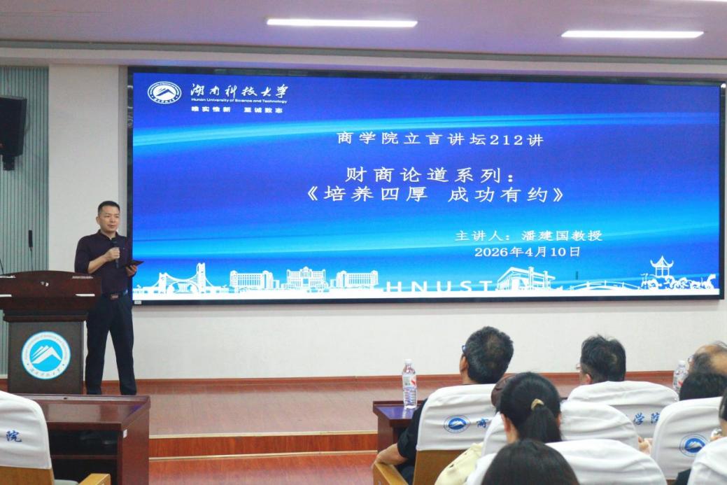 4月10日下午,广州酒家集团股份有限公司党委委员潘建国教授受邀做客商学院立言讲坛212讲,以“财商论道系列:《培养四厚 成功有约》”为题作了学术讲座,商学院院长戴魁早主持会议。